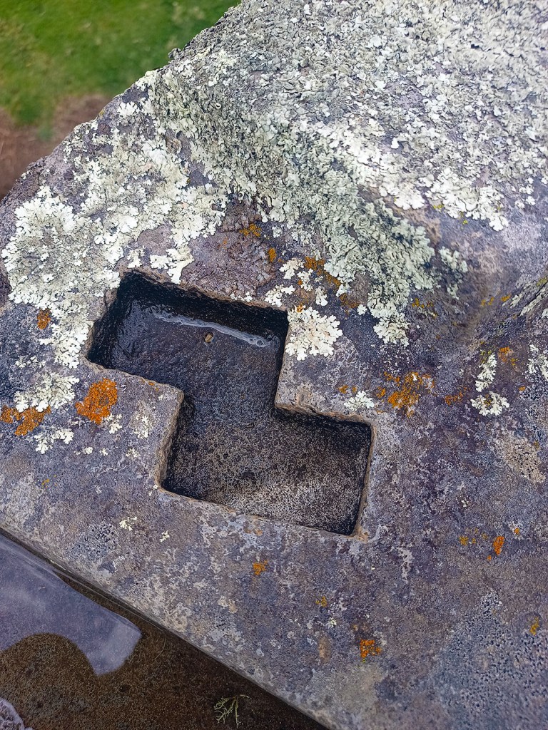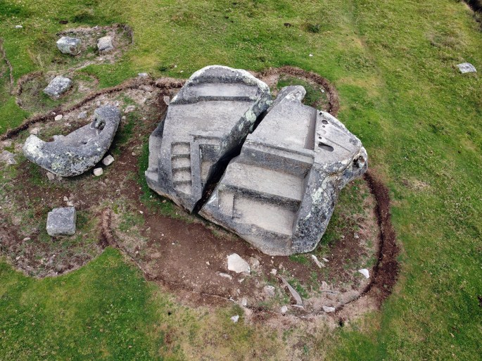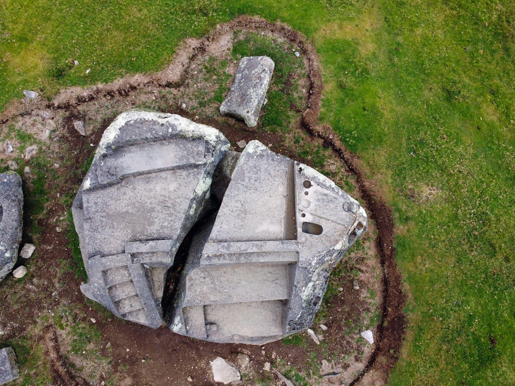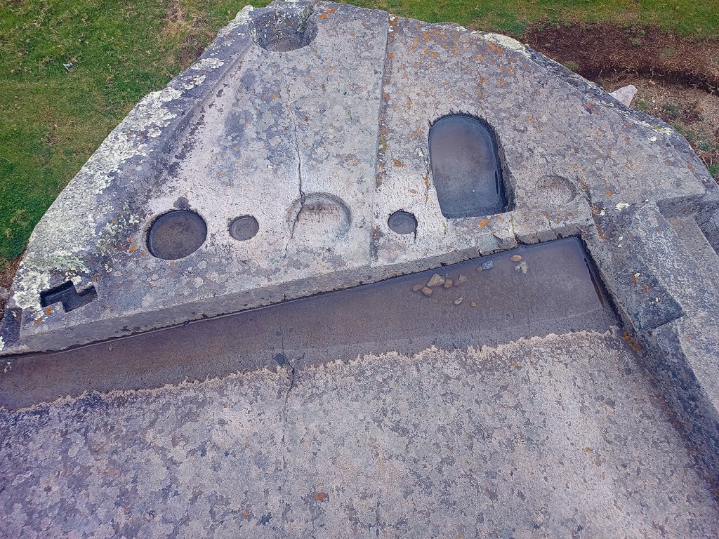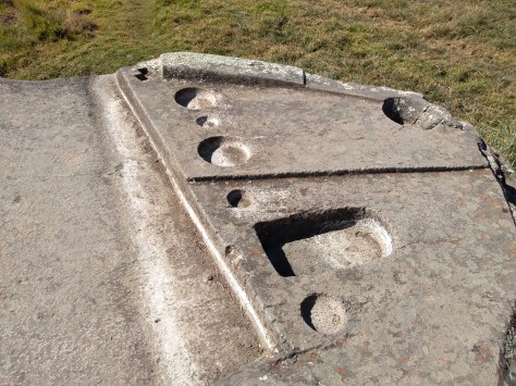 La roche principale est fendue en deux et la moitié a légèrement basculé, cependant les plateformes et reliefs taillés sont impressionnants. L’un des creux probablement destiné à recevoir des liquides lors de cérémonies, possède deux canaux s’écoulant sur le côté du rocher.