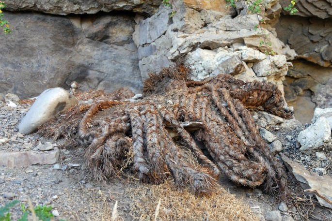 Remarquez les paquets funéraires en fibres végétales abandonnés par les huaqueros. Les momies des civilisations de l’intermédiaire tardif de l’Altiplano étaient généralement emballées dans ce type de paquet funéraire tressé en ichu (herbe typique de l’étage écologique Suni). Le corps était positionné en position fœtale.