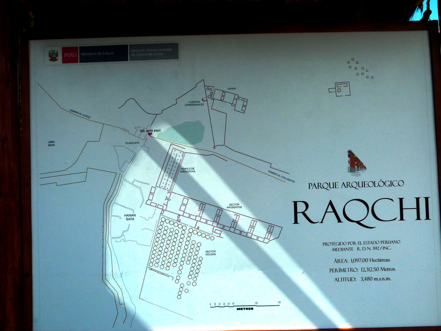 Du croisement, la piste vous mènera jusqu’à la place de Raqchi où se trouve un marché touristique (la spécialité locale est la céramique) et la chapelle San Miguel Arcangel (du 17 eme siècle). L’entrée du site et la billetterie se trouvent à droite de la chapelle. Vous pouvez normalement trouver un guide local facilement. Le site de Raqchi fut construit durant le règne de l’inca Wiracocha (à ne pas confondre avec le dieu du même nom) puis terminé par Pachacutec et Tupac Yupanqui. Raqchi avait une fonction cérémonielle et administrative. Si les études archéologiques ont démontrée que le site fut occupé depuis l’an 200, les édifices qu’on observe datent de l’époque inca.