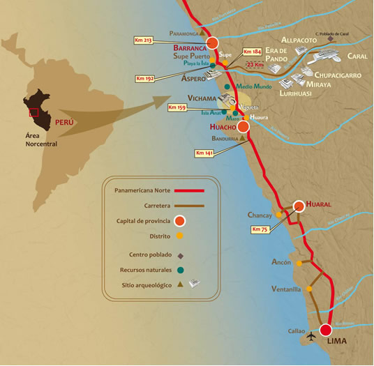 La civilisation Caral s’est établie entre la côte et la basse vallée du fleuve Supe à 150 km au Nord de Lima entre les années -3000 et -1800. Au total on trouve 20 sites archéologiques contemporains à celui de Caral dans la vallée de Supe. Le site éponyme à été étudié depuis le début des années 90 par l’archéologue Ruth Shady puis déclaré patrimoine mondial de l’UNESCO en 2009. La restauration et mise en valeur s’est faite à partir des années 2010. Aujourd’hui le projet archéologique Caral-Supe fouille une douzaine de sites de la vallée de Supe et a aménagé des circuits touristiques sur les sites de Caral, Aspero et Vichama.