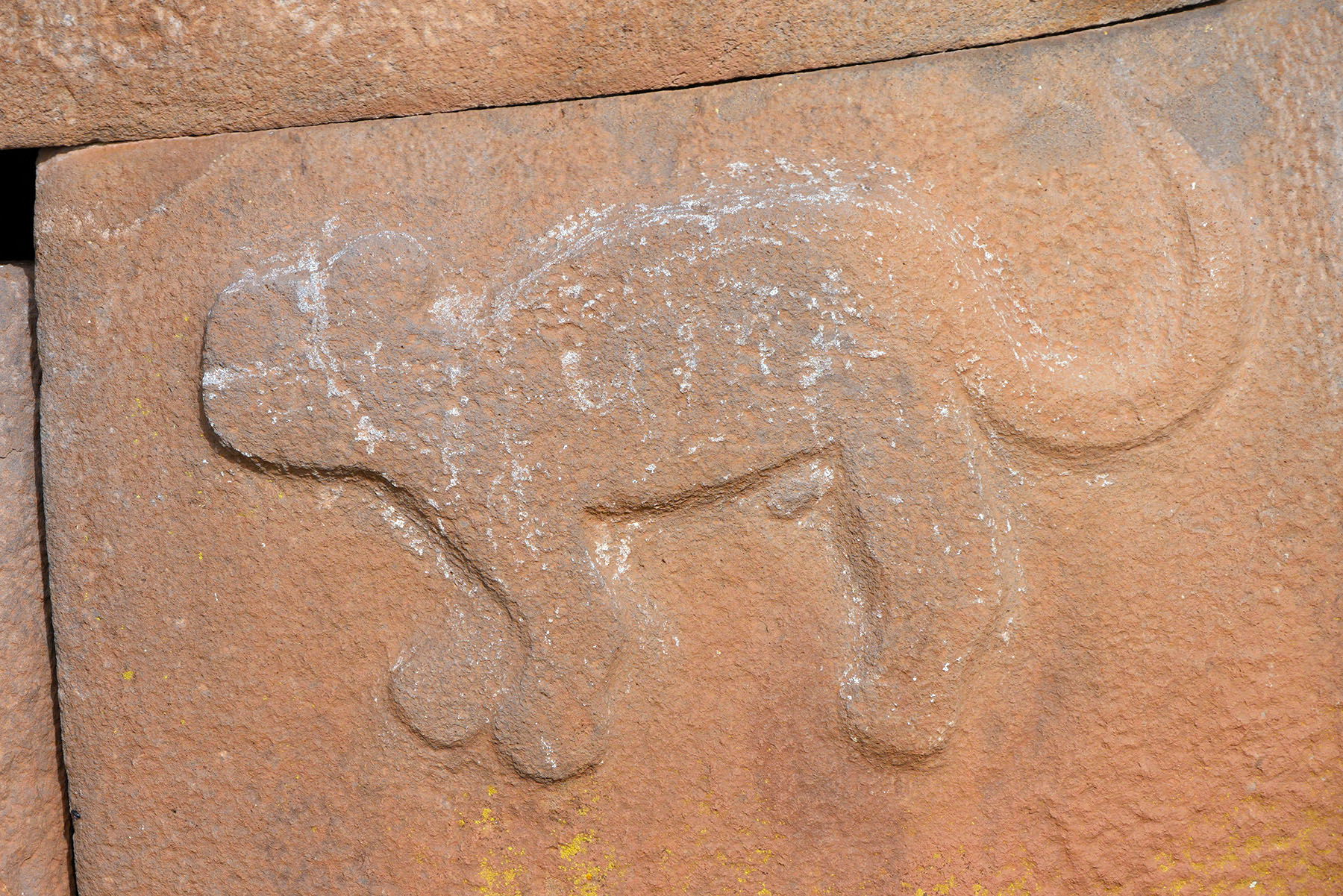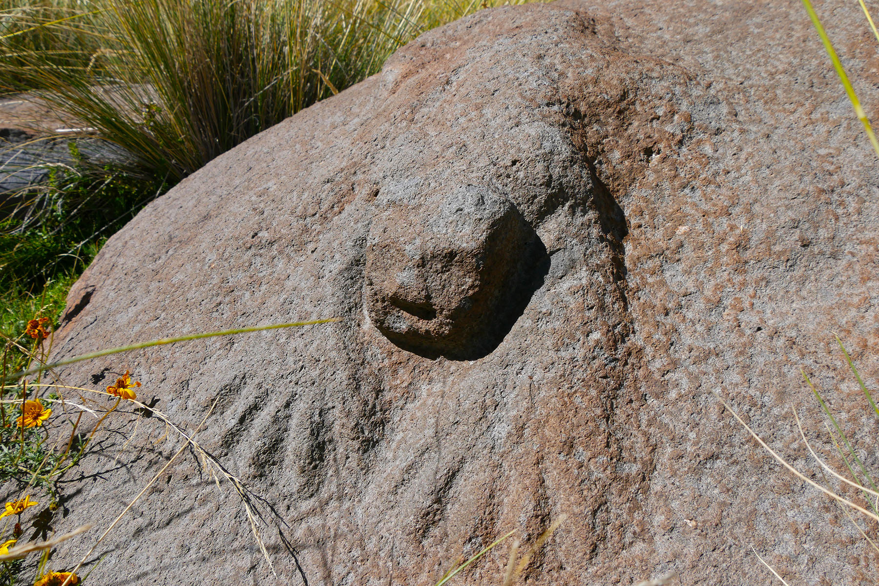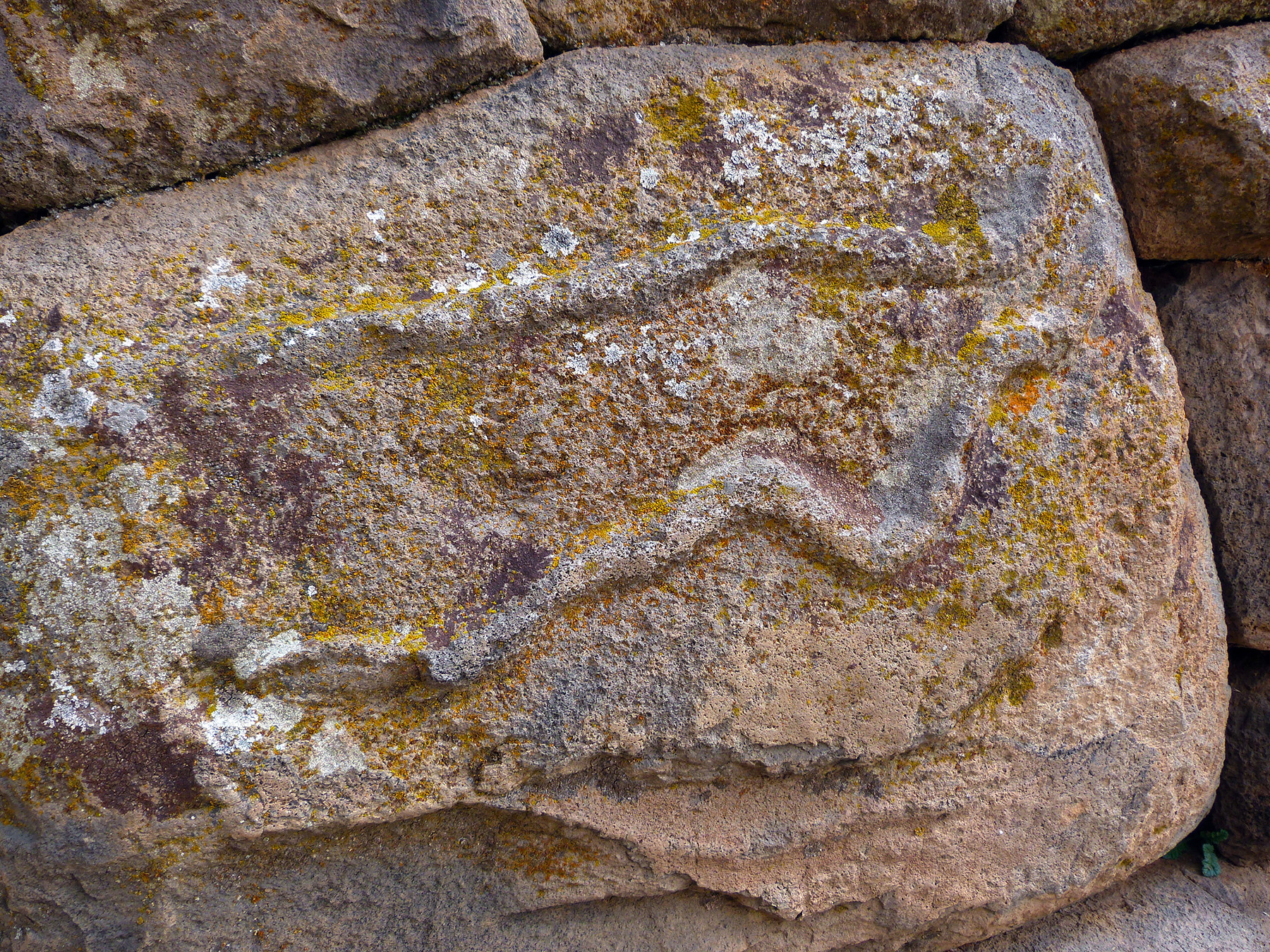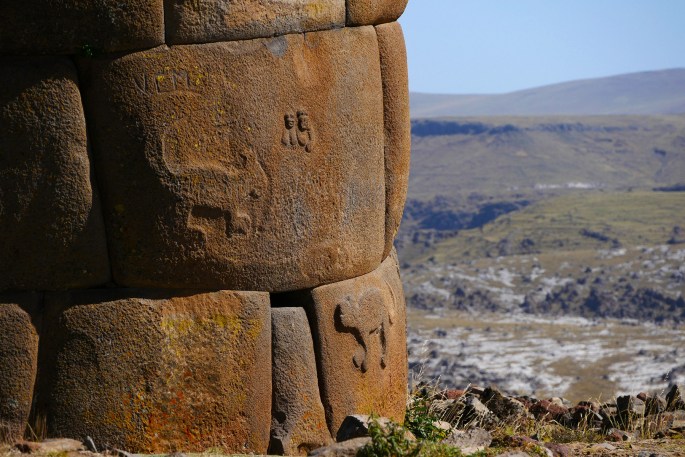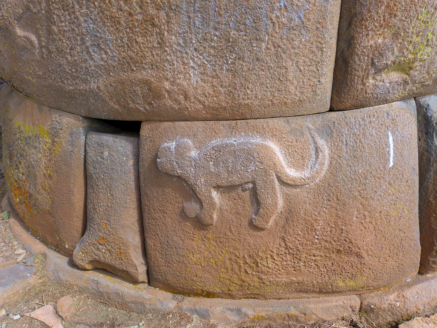 La chullpa circulaire n°2 possède une maçonnerie en coussin de type polygone cyclopéen. On notera que les pierres (andésite) ont été extraites sur le site. La chullpas possède de superbes représentations d’animaux en hauts reliefs : une viscacha (lagidium peruanum) et un puma encadrent la porte.