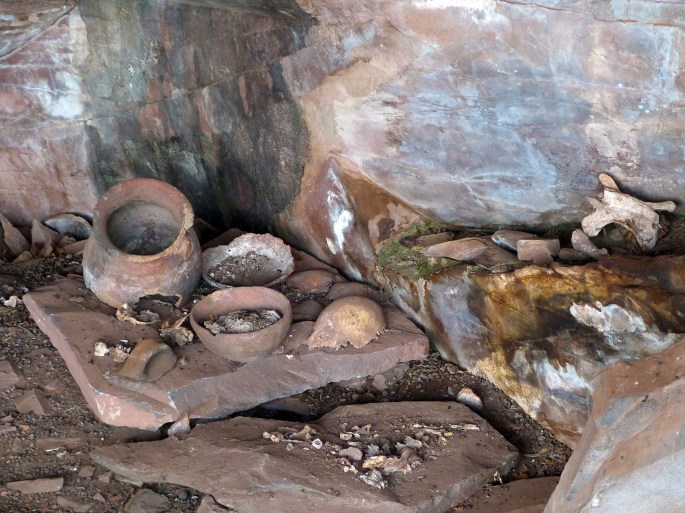 Il existe 6 cavités rocheuses utilisées comme des ossuaires ou des tombes collectives. Ces lieux ont malheureusement été pillés et dégradés. Si il ne reste presque que des os dispersés, on peut imaginer grâce à d’autres sites similaires de la région que les personnes étaient disposées en position fœtale et empaquetées dans des cordelettes en fibres végétales et accompagnées d’objets et de céramiques.