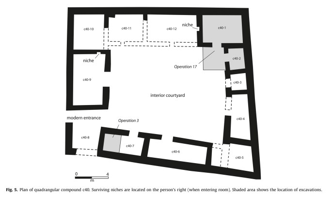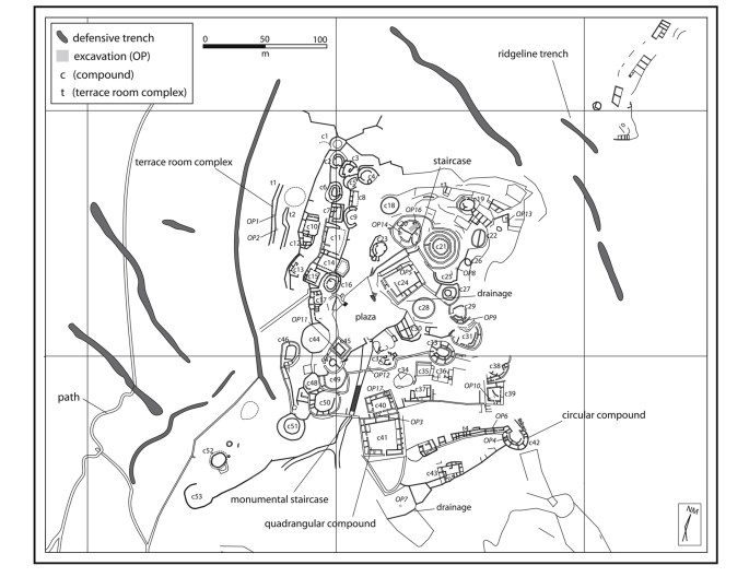 Les éléments principaux du site semblent avoir mobilisé une large main d’œuvre et avoir été planifié alors que les complexes résidentiels, de taille et d’aspects différents, auraient pu être à charge de groupes plus petits et autonomes, peut-être des groupes familiaux.
